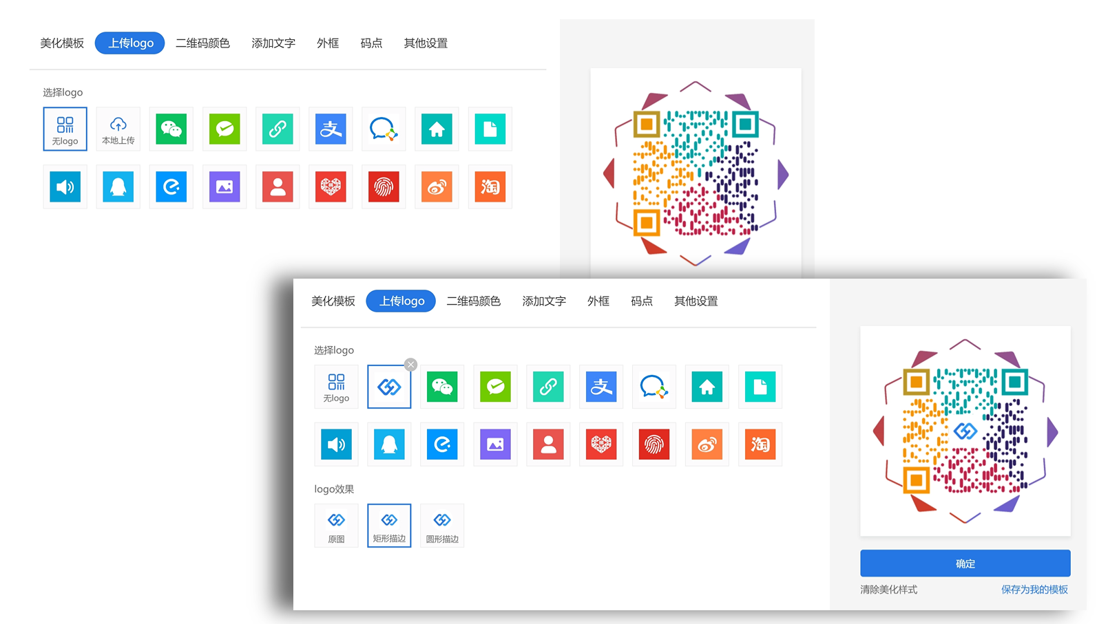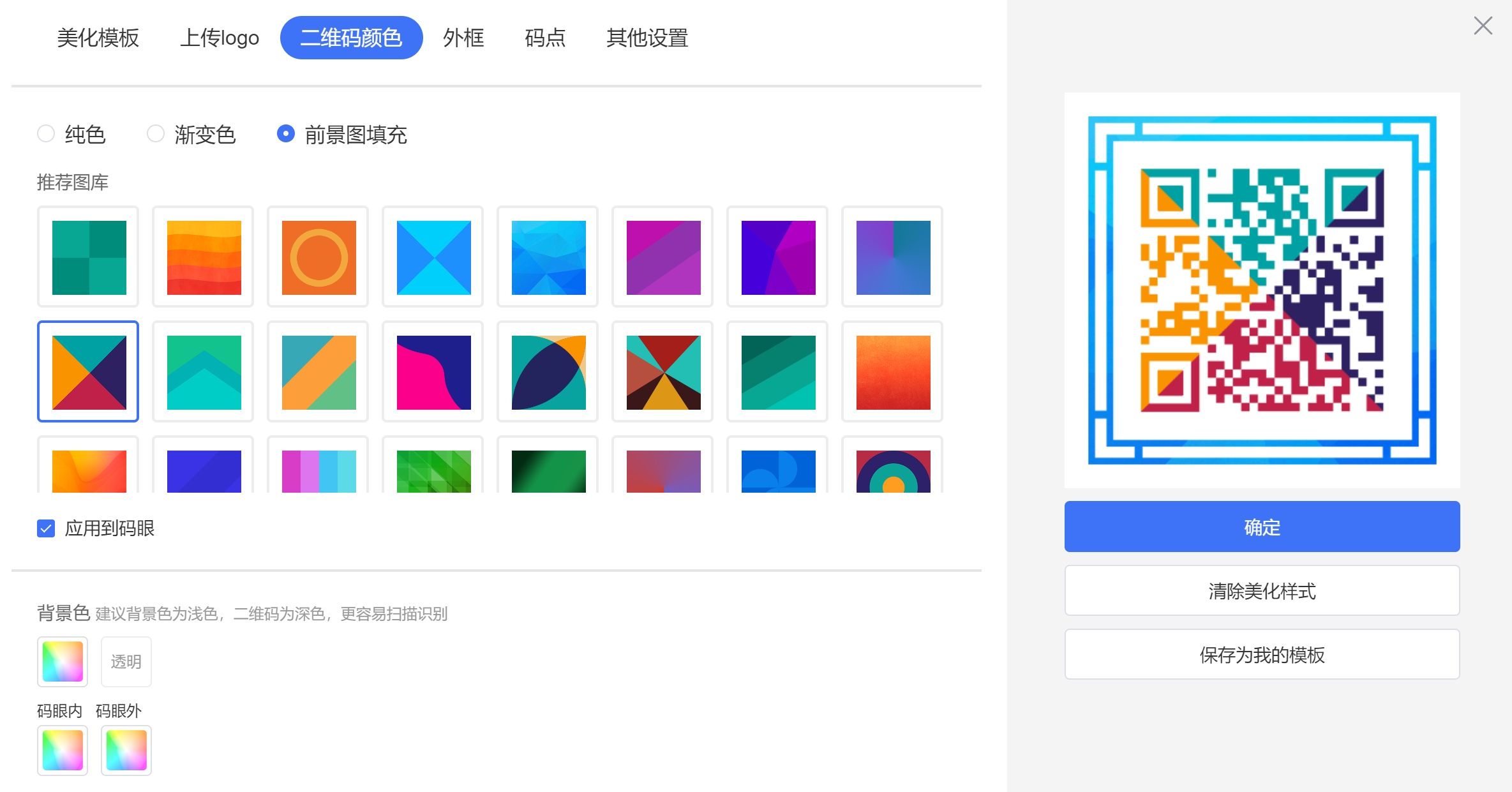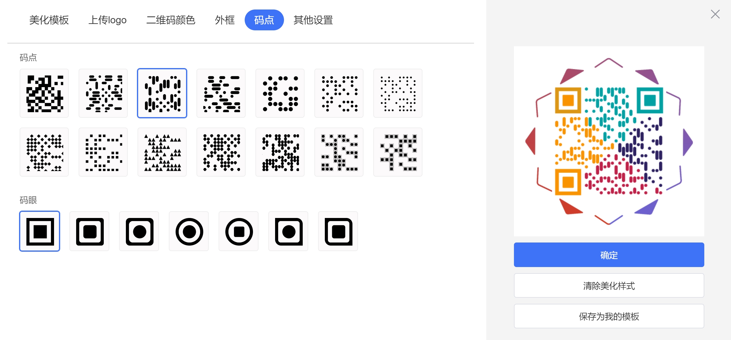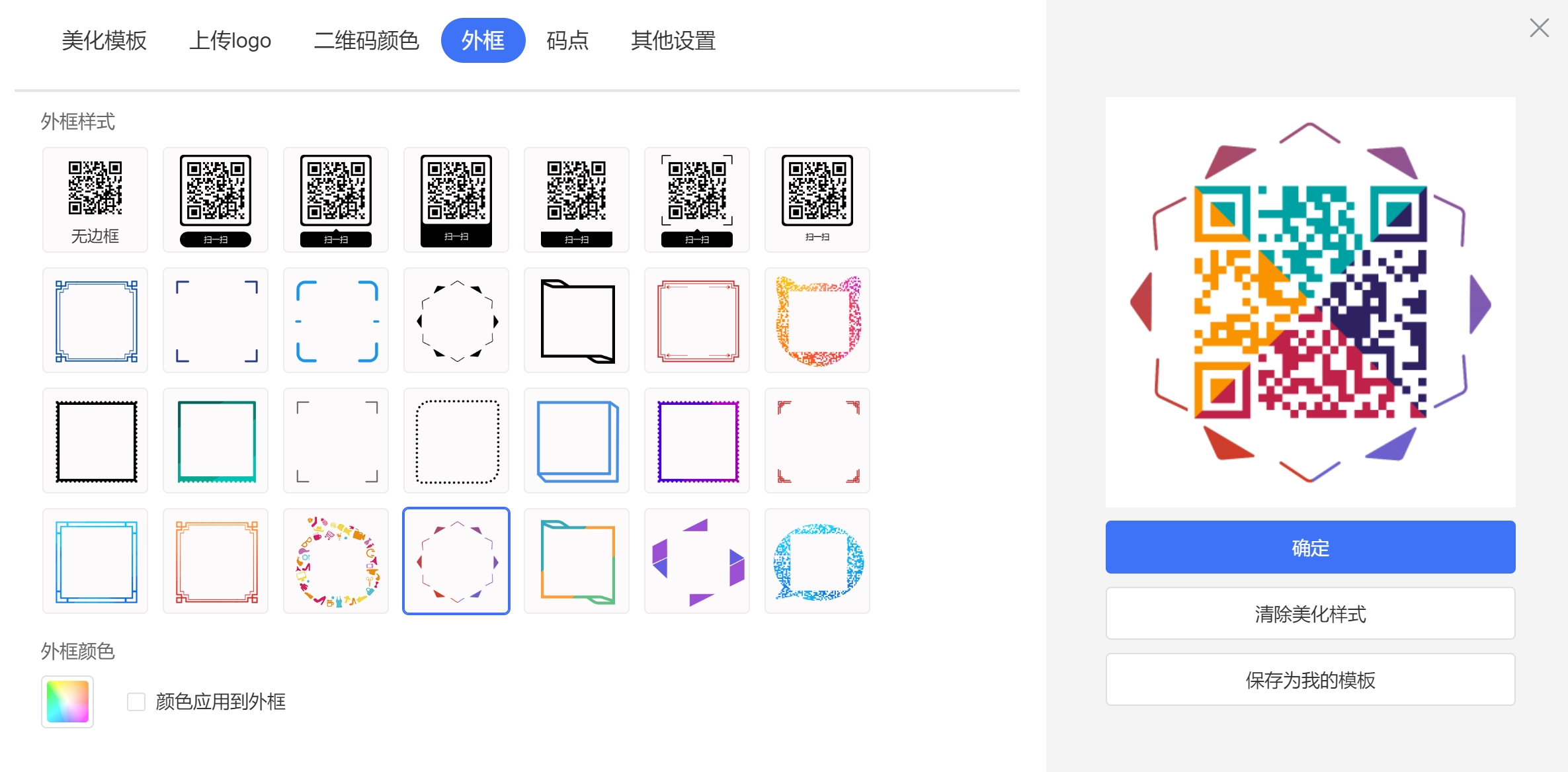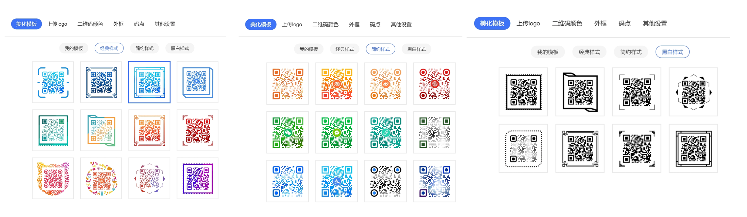 对生成的二维码进行美化,可以直接一键套用平台预设的美化模板。