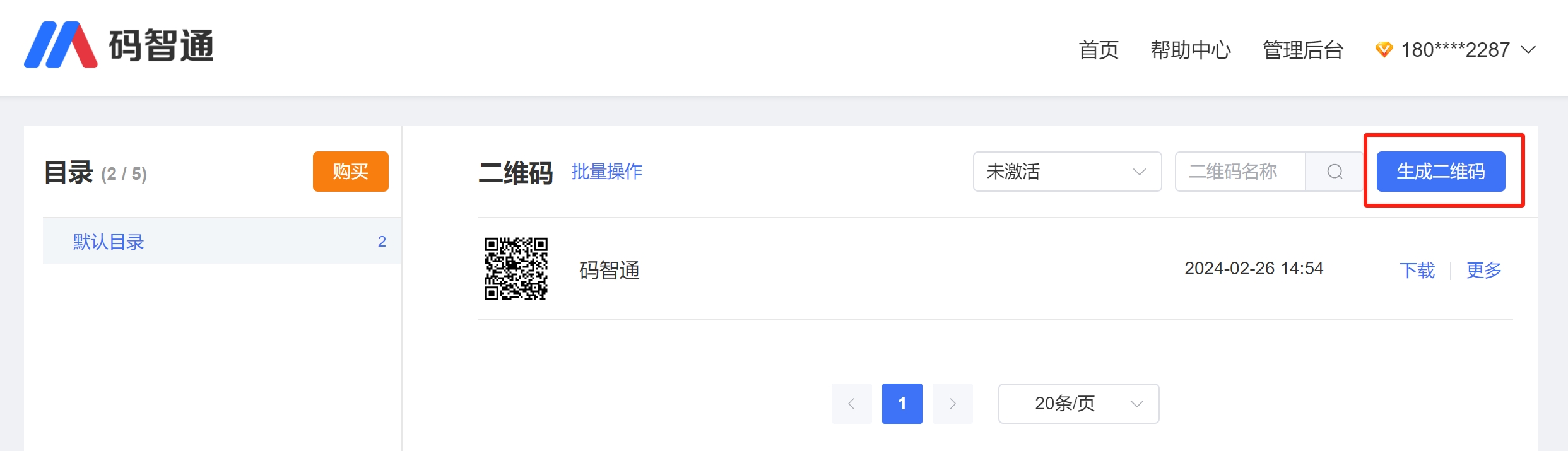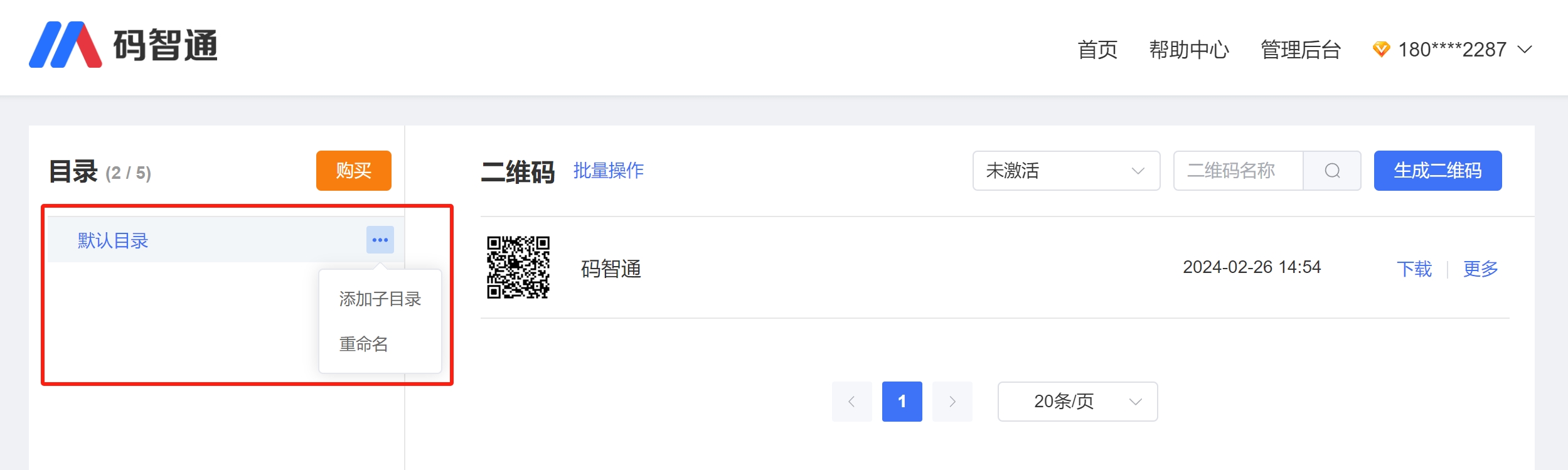 如果需要对生成的二维码进行分类,点击【默认目录】,可以对默认目录进行“重命名”或者“添加子目录”。