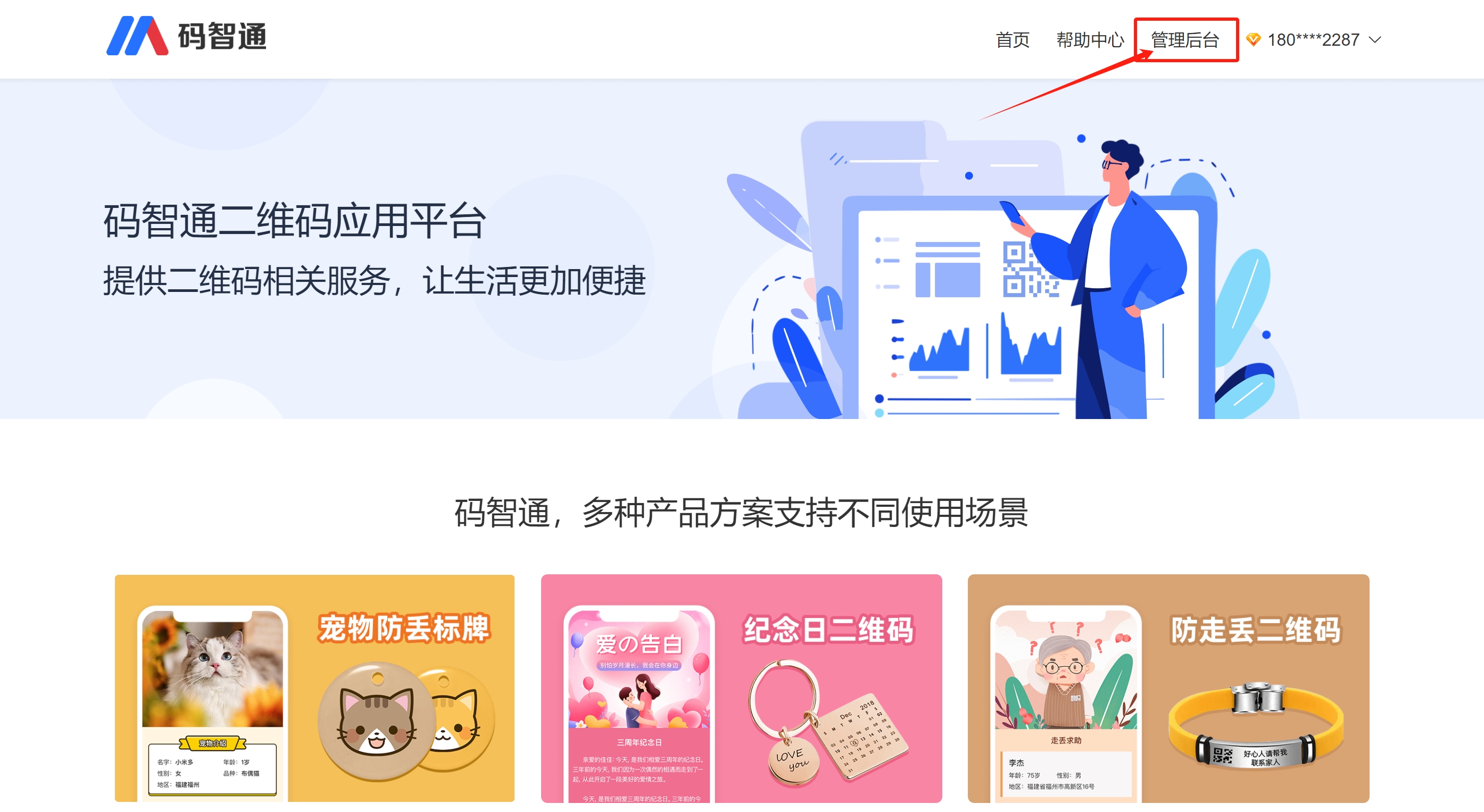 在首页点击【管理后台】进入后台进行生成二维码操作。